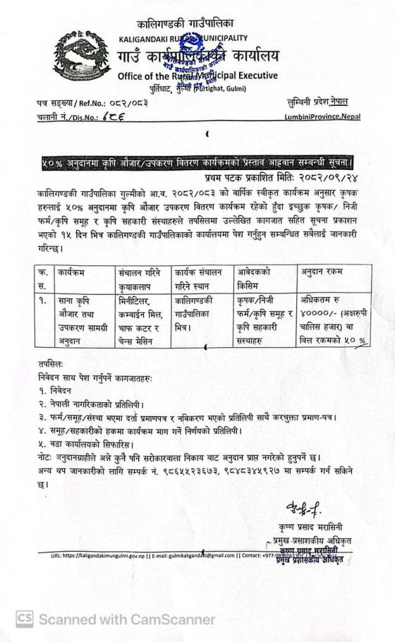 ५० प्रतिशत अनुदानमा कृषि उपकरण वितरण कार्यक्रमको प्रस्ताव आह्वान सम्बन्धी सूचना