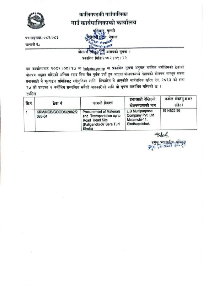 » बोलपत्र स्वीकृत गर्ने आशयको सूचना