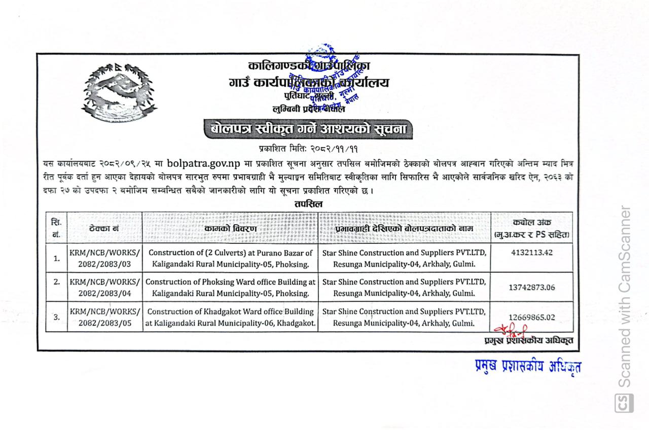 बोलपत्र स्वीकृत गर्ने आशयको सूचना